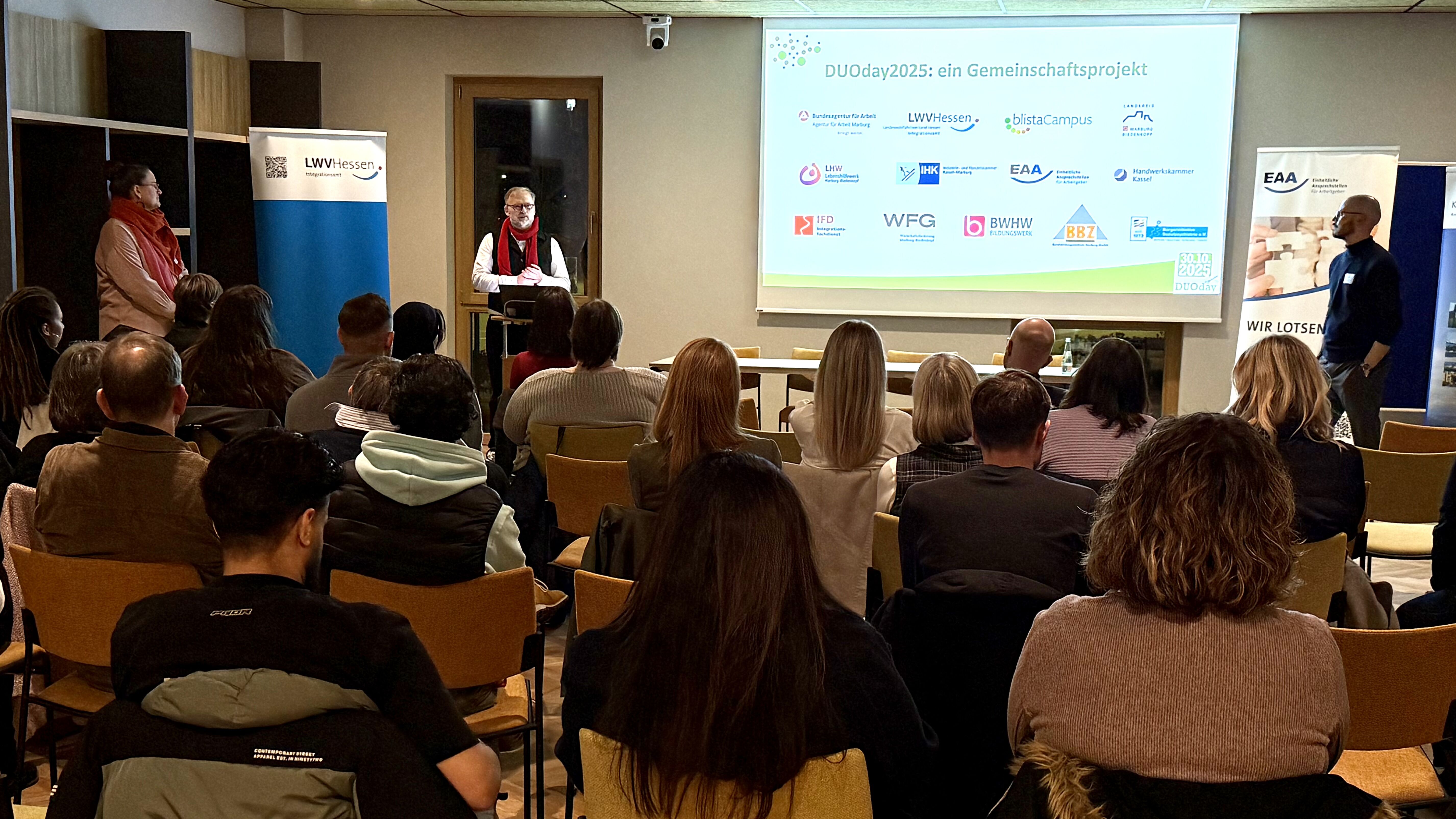 Am 18. November 2025 fand in der Jugendherberge Marburg die Abschlussveranstaltung des ersten DUOday im Landkreis Marburg-Biedenkopf statt. Rund 40 Gäste, darunter 14 Vertreter:innen teilnehmender Unternehmen, kamen zusammen, um gemeinsam auf den Aktionstag zurückzublicken, Erfahrungen auszutauschen und neue Netzwerke zu knüpfen.